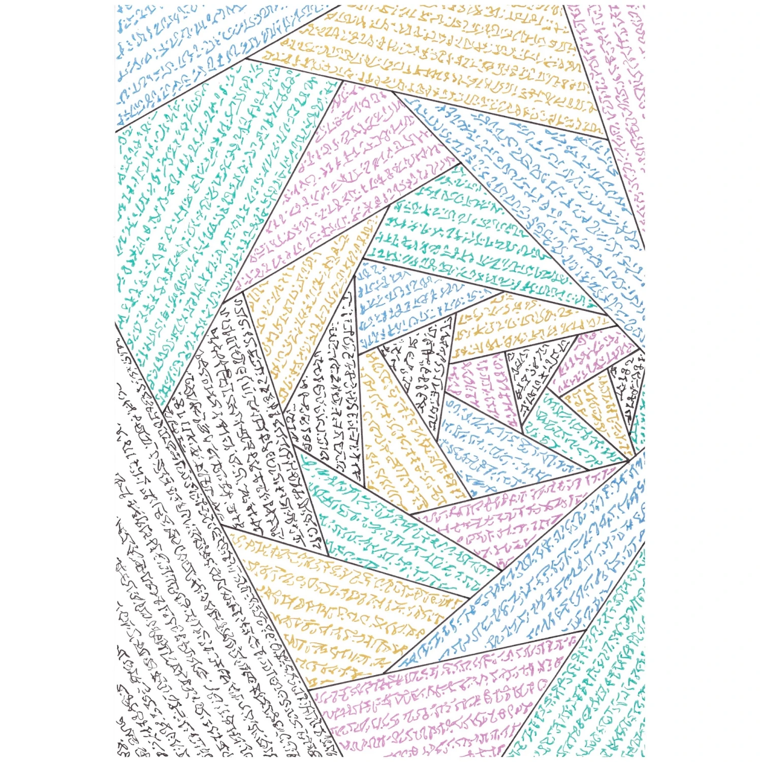 Après avoir dessiné tous les traits, j'ai remarqué une suite de triangles intéressante, je les ai remplis de codes en noir, puis j'ai complété les autres formes avec d'autres couleurs.