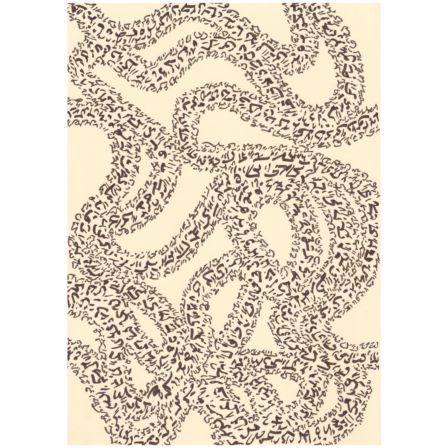 Pour celle-ci j'avais envie d'écrire des codes en faisant des ondulations et en me dirigeant un peu partout sur la feuille, puis en entourant ces lignes avec des lignes de codes plus petites.